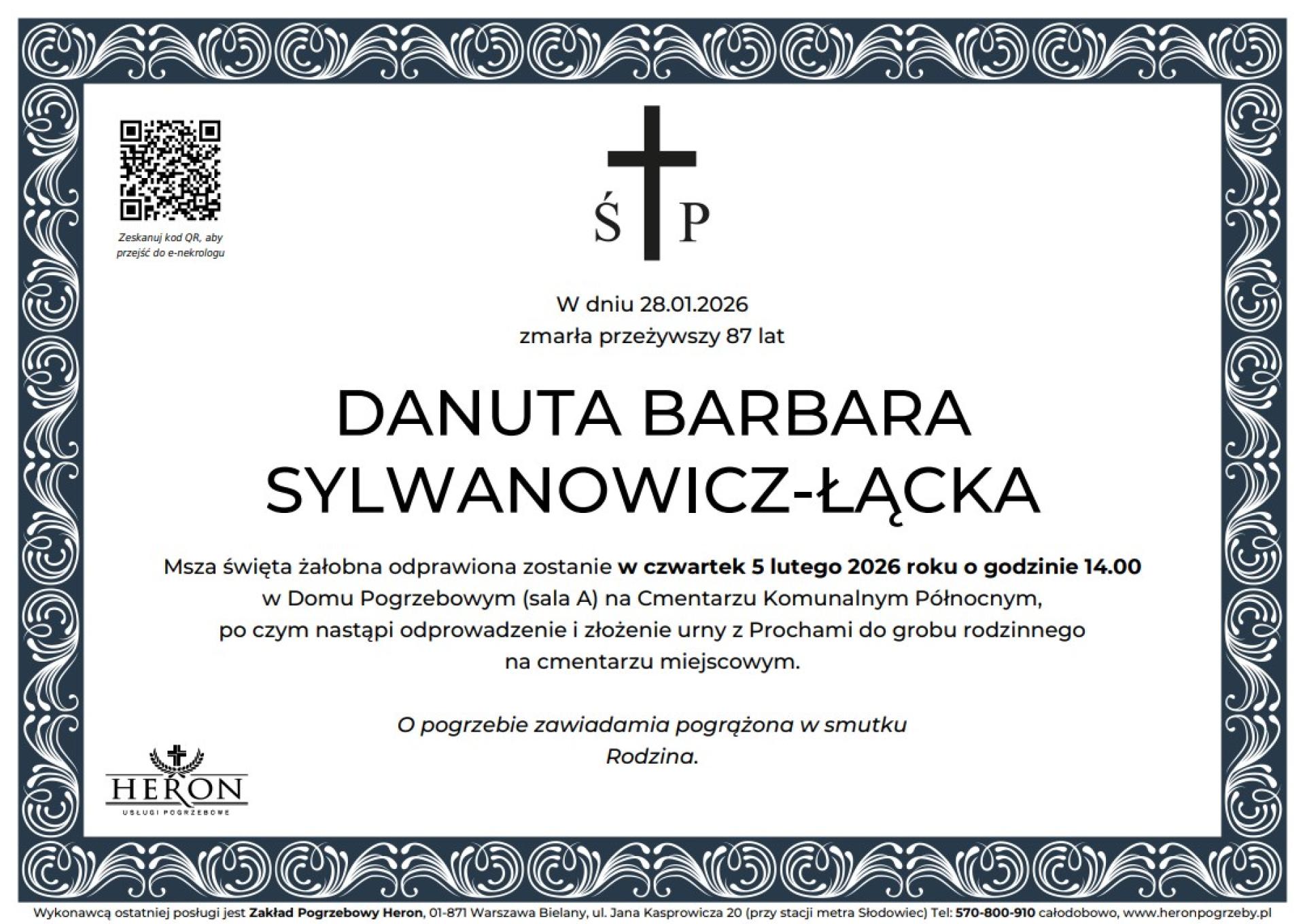 Msza Święta za duszę Ś.P. Danuty Sylwanowicz-Łąckiej odbędzie się 5 lutego 2026 r. o godz. 14:00 w Domu Pogrzebowym (sala A) na Cmentarzu Komunalnym Północnym Kazimierza Wóycickiego 14, Warszawa. Ceremonia pogrzebowa odbędzie się na tym samym cmentarzu - Kwatera: W-VI-10 Rząd: 13, Grób: 8.
