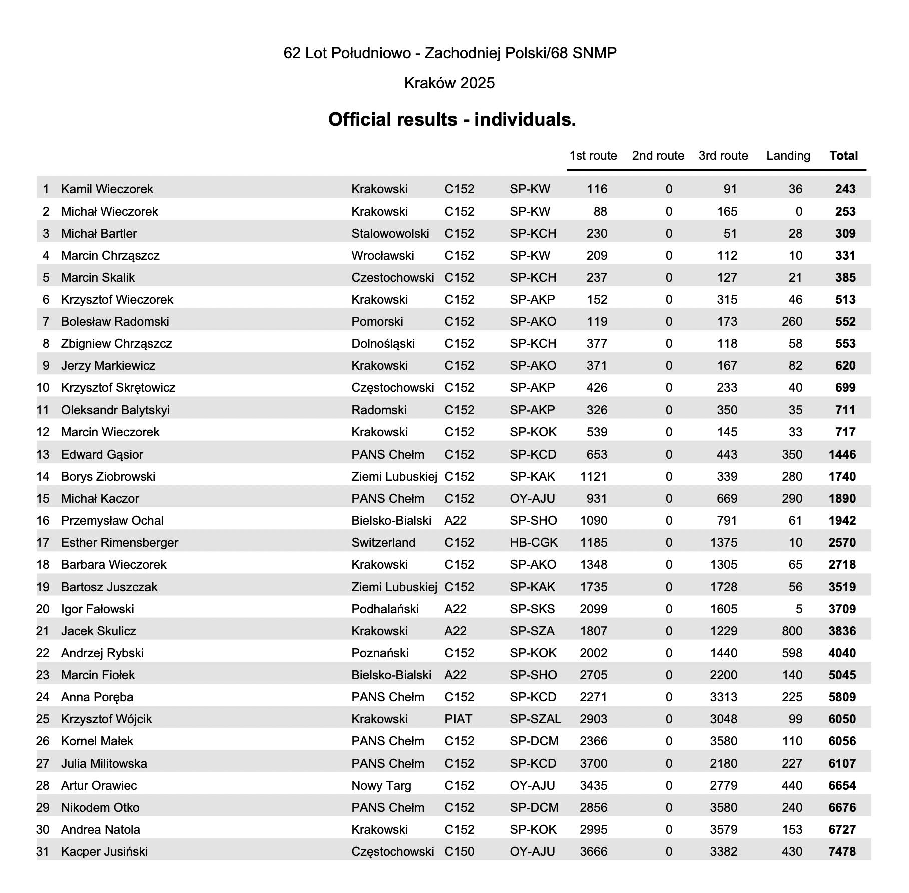 W tegorocznej edycji Lotu Południowo-Zachodniej Polski im. Franciszka Żwirki oraz 68. Samolotowych Nawigacyjnych Mistrzostwa zwycięzcą z tytułem Mistrza Polski został Kamil Wieczorek z Aeroklubu Krakowskiego. Po zaciętej rywalizacji Wicemistrza Polski wywalczył Michał Wieczorek z Aeroklubu Krakowskiego. Tuż za nim wylądował Michał Bartler z Aeroklubu Stalowowolskiego.