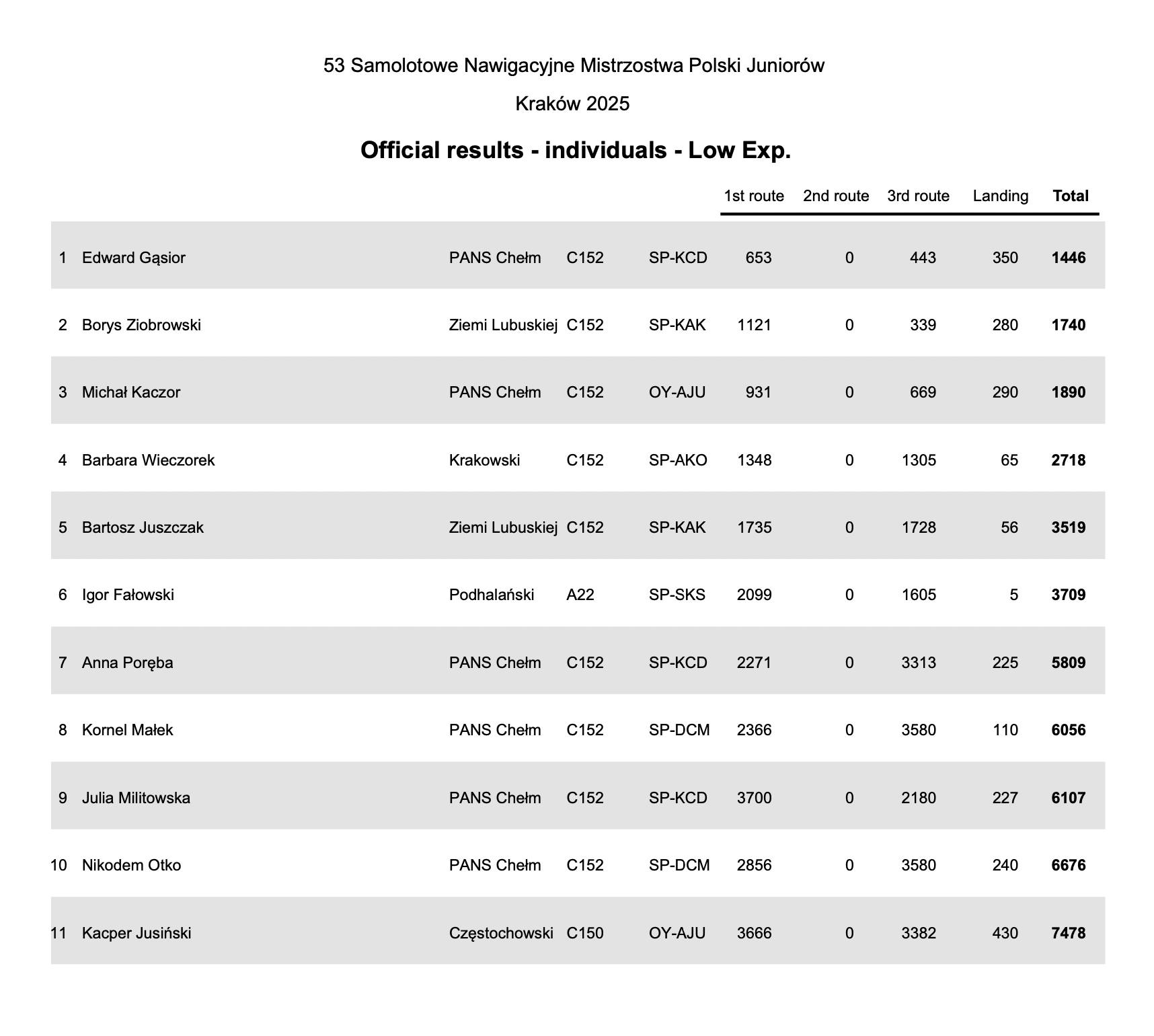 Rywalizacja zakończyła się również wyłonieniem zwycięzców 53. Samolotowych Nawigacyjnych Mistrzostw Polski Juniorów. Mistrzem Polski Juniorów został Edward Gąsior z Państwowej Akademii Nauk Stosowanych w Chełmie. Tytuł Wicemistrza Polski Juniorów wywalczył Borys Ziobrowski z Aeroklub Ziemi Lubuskiej. Trzecie miejsce na podium Juniorów zdobył Michał Kaczor z Państwowej Akademii Nauk Stosowanych w Chełmie.