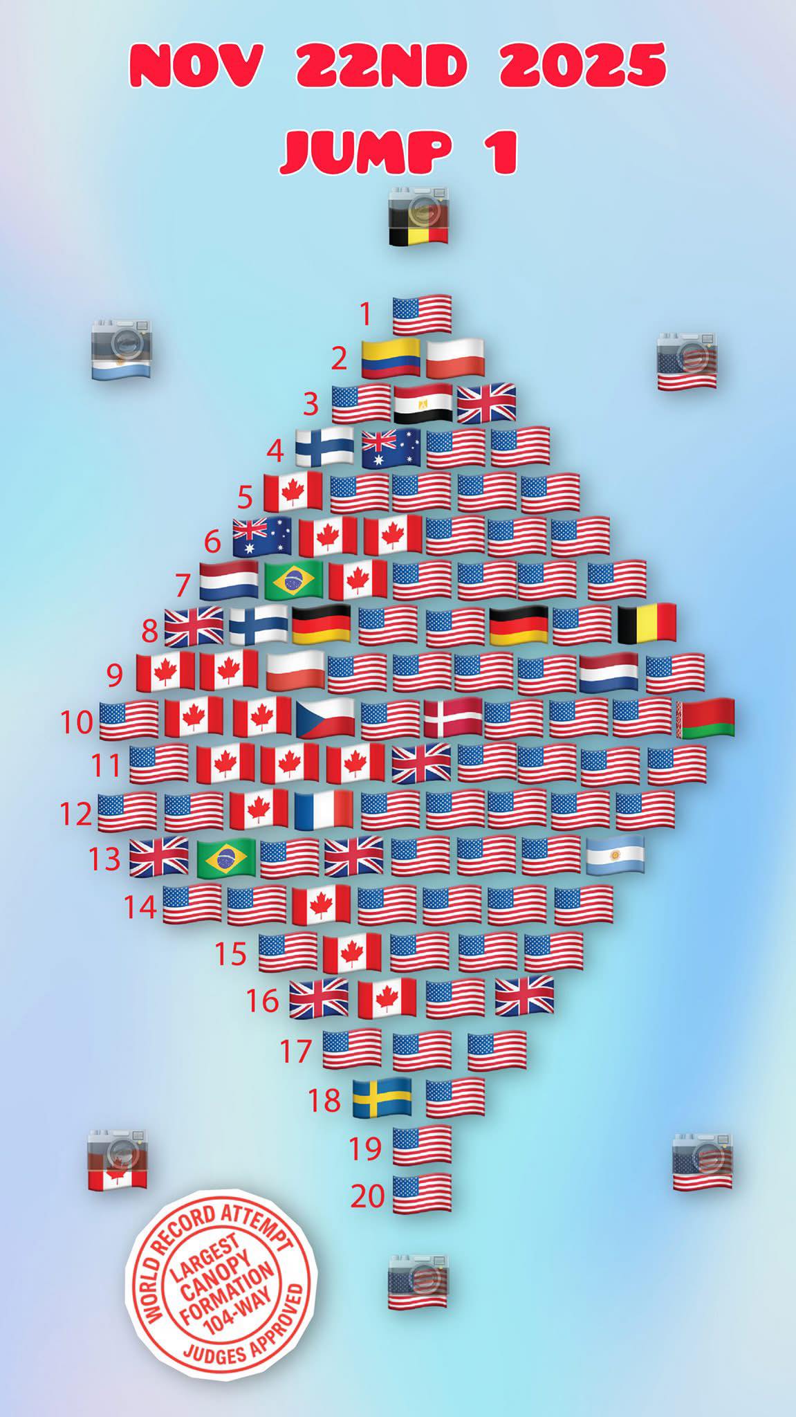 Teraz, 22 listopada 2025 r., po kilku dniach próby udało się pobić skoczkom poprzedni rekord. Po 18 latach i 1 dniu spadł stary rekord świata Canopy Formations. 104-Way to nowy punkt odniesienia! Ten dzień przejdzie do historii dzięki 104 skoczkom spadochronowym.