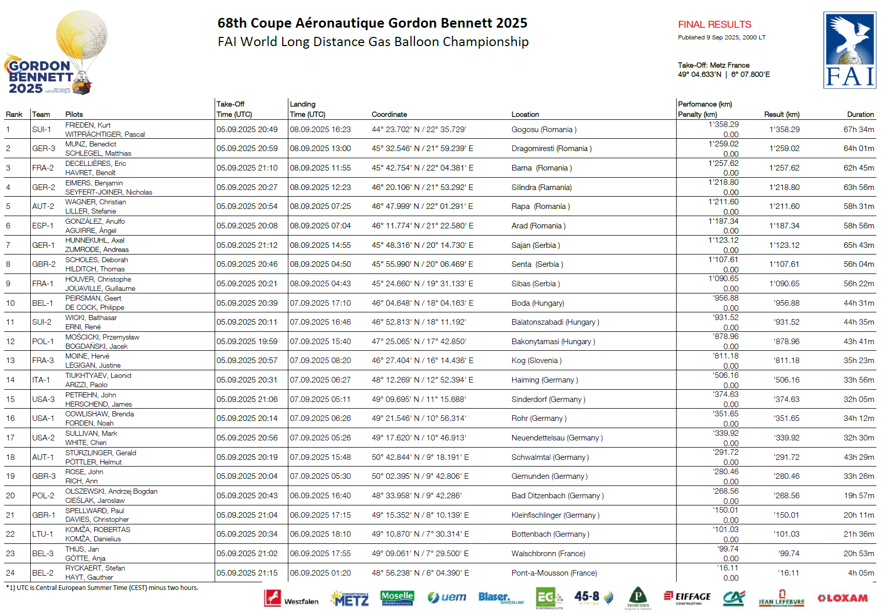 Wraz z wylądowaniem 8 września o godz. 19:55 ostatniego balonu – załogi szwajcarskiej SUI-1 – wyścig Gordona Bennetta 2025 dobiegł końca. Znamy już tegorocznego zdobywcę Pucharu.