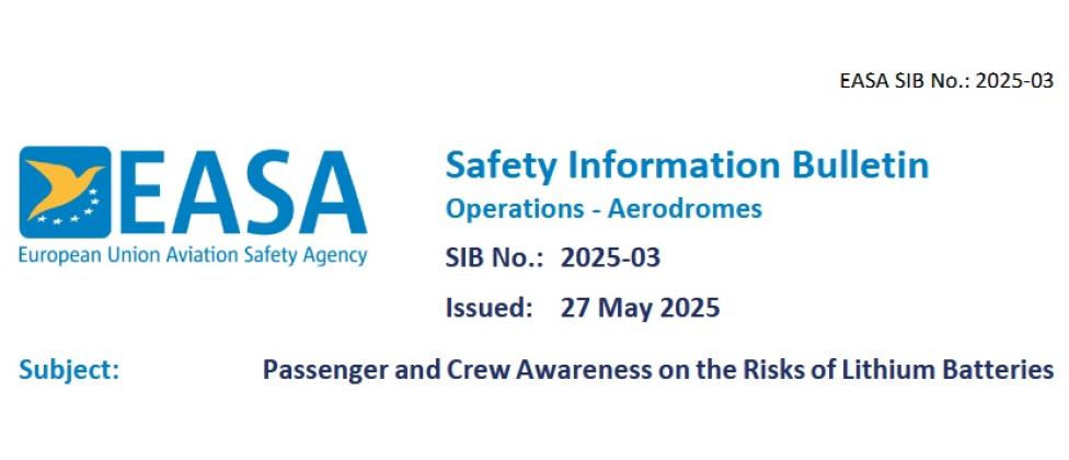 27 maja 2025 r., Europejska Agencja Bezpieczeństwa Lotniczego (EASA) wydała Biuletyn Bezpieczeństwa (SIB: 2025-03 ) podkreślający istotę świadomości pasażerów i załogi w zakresie ryzyka związanego z bateriami litowymi.