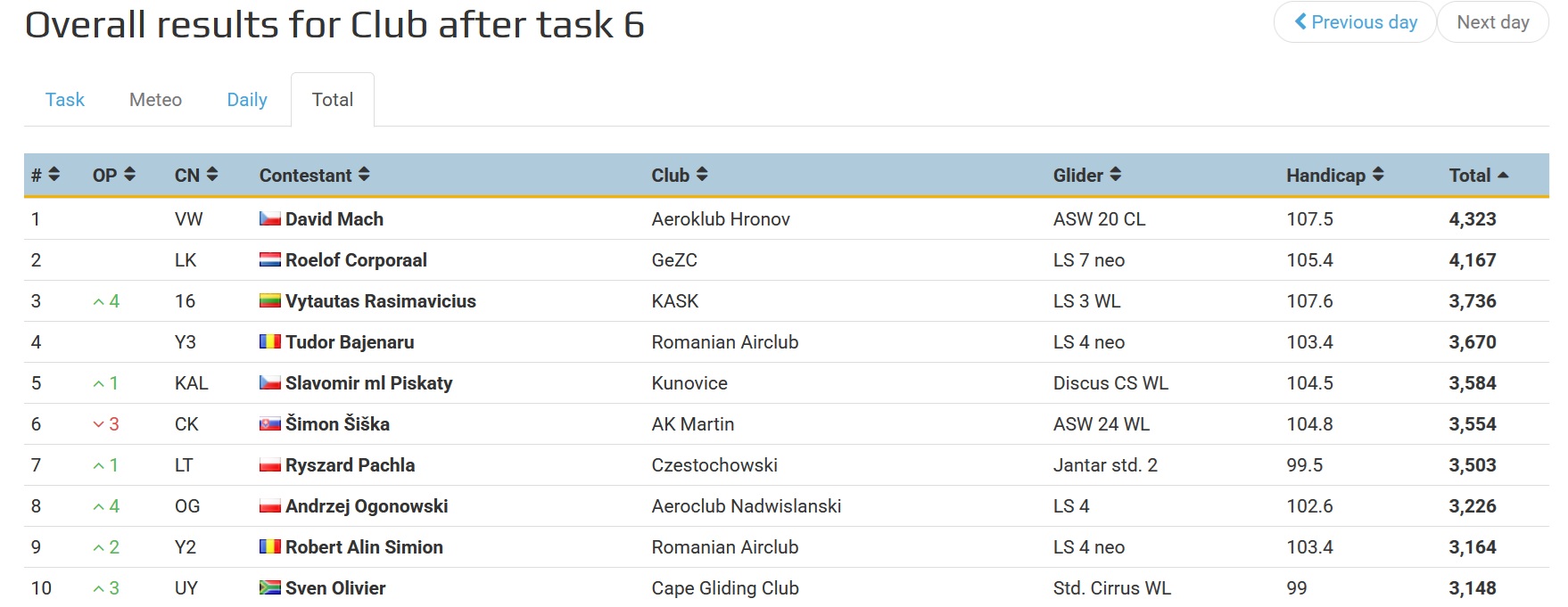 W klasie Club na pierwszym miejscu znajduje się Czech David Mach (Aeroklub Hronov – szybowiec ASW 20 CL), który zdobył 4,323 punkty, na drugim Holender Roelof Corporaal (GeZC - LS 7 neo) z 4,167 punktami, a na trzecim Litwin Vytautas Rasimavicius (KASK - LS 3 WL) z 3,736 punktami.