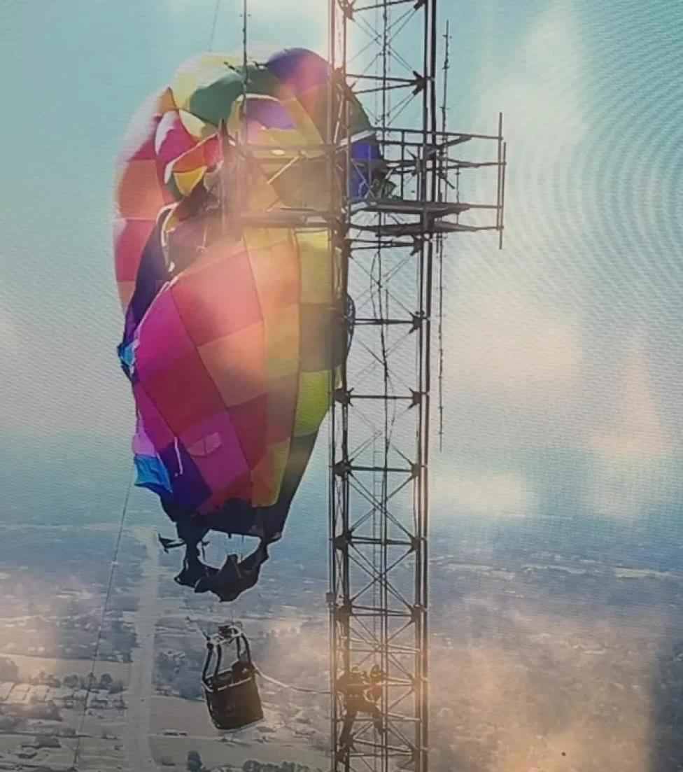 Opublikowane przez służby zdjęcia pokazywały poszarpaną powłokę balonu zaplątaną w stalowej konstrukcji masztu, podczas gdy kosz z dwiema osobami w środku kołysał się na wietrze.