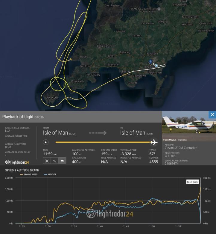 Brytyjska Komisja ds. Badania Wypadków Lotniczych (AAIB) stwierdziła, że pilot, który rozbił się o klif na Wyspie Man, „prawdopodobnie” zrobił to celowo. 17 lipca 2023 r. 64-letni mężczyzna latał swoją Cessną 210M Centurion (znaki rejestracyjne G-TONT) w pobliżu Bradda Head, który to lot zakończył się uderzeniem w ziemię.