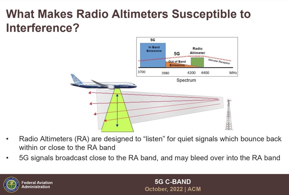- Radiowysokościomierze pracują w paśmie 4,2–4,4 GHz, a nowe pasma łączności bezprzewodowej, w szczególności C-Band i pasma sąsiednie, mogą zakłócać ich działanie, jeśli nie zostaną zastosowane odpowiednie środki techniczne.