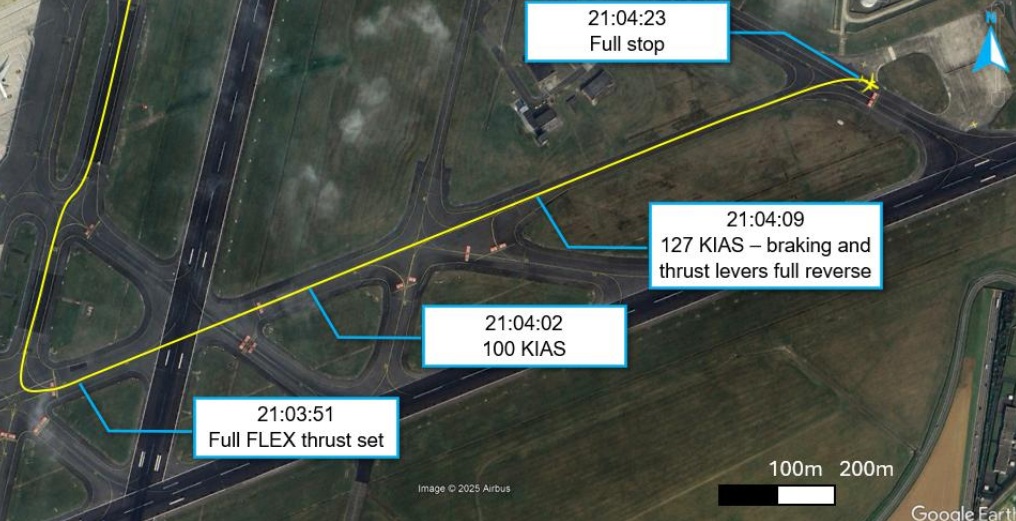 Załoga natychmiast zastosowała maksymalne hamowanie oraz odwracacze ciągu. W tym momencie samolot osiągnął już 127 węzłów (235 km/h), czyli tuż poniżej prędkości V1 wynoszącej 132 węzły (244 km/h).